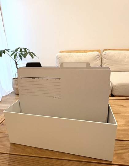 ご家庭では市販のファイルボックスを用いて個別フォルダを立てて収納いたします。