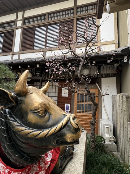 錦天満宮の牛さん(多くの参拝者におでこを撫でられピカピカになってはりました)の奥の梅が咲いていたんです。